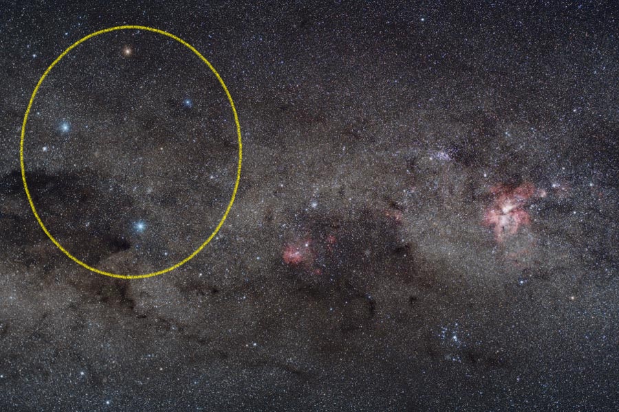 3. alinhadas com a estrela da ponta de cima (se imaginarmos que estamos vendo a cruz na posição “de pé”, à esquerda da cruz), formando uma linha reta com essa estrela da ponta, veremos duas estrelas bem brilhantes. Não vou falar sobre elas agora, mas são bem fáceis de serem observadas.