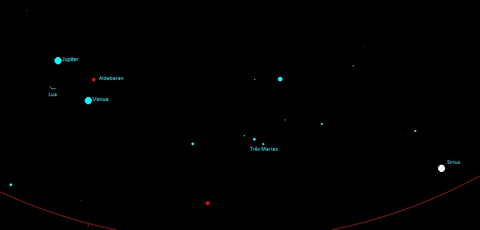 Essa visão persiste por um bom tempinho ainda, mas amanhã, notem bem AMANHÃ, Vênus e Júpiter ganham uma companheira de espetáculo. A estrela Aldebaran, a mais brilhante da constelação de Taurus, vai se alinhar com os dois planetas numa linha quase perfeitamente reta. É fácil distinguir os três astros: Júpiter estará acima BEM brilhante, Vênus logo abaixo ainda MAIS brilhante, e Aldebaran será o pontinho avermelhado que se alinha logo abaixo. Acreditem em mim, vai valer o sacrifício de acordar cedo.