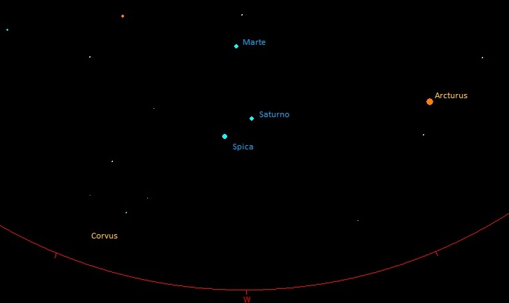 Muito bem… olhando pros lados do Oeste (:D) lá pelas 19:00, três objetos celestes vão estar bem destacados no céu a uma altura não muito alta, já próximos do horizonte. São eles: Spica (que você pode conhecer melhor aqui), e os planetas Saturno e Marte. A imagem que vai aparecer no céu é mais ou menos a seguinte: