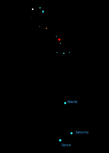 Bom, mas vamos manter o foco e lembrar que este post é sobre Scorpius. Para facilitar as coisas, vou diminuir o zoom da imagem acima, de modo que seja possível ver uma porção maior do céu. Logo acima de Marte, mais para o alto do céu, será possível ver um conjunto muito bonito de estrelas. Vejam a imagem abaixo: