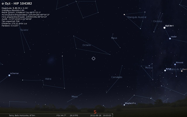 O céu acima foi obtido com o atlas celeste digital Stellarium, para o dia 18 de setembro de 2012. Polaris Australis está indicada no centro. À direita vemos a constelação do Cruzeiro do Sul, e podemos observar que a haste maior do Cruzeiro aponta para ela. Notem o ponto cardeal sul (letra S), na superfície da Terra.